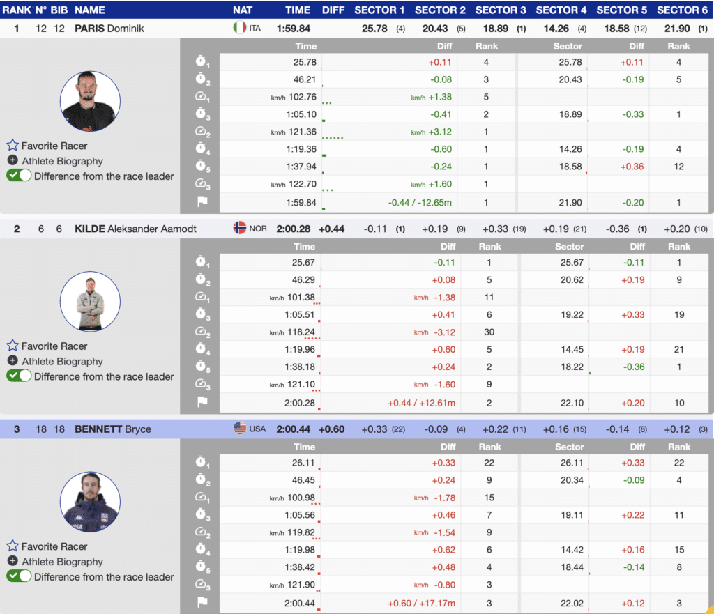 Today belongs to Italy. On home soil, the big man Dominik Paris won his first World Cup since March 2022. The winner of 22 career World Cups is the toast of Val Gardena/Gröden. Paris, a highly respected speed skiing rocket, surprises today as he failed to achieve a single downhill podium last season. However, today, he is the best in the world! He skied with determination from the start to the finish first but used high-speed sectors three and the final sector six to secure a dominant (-0.44) victory.