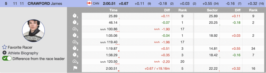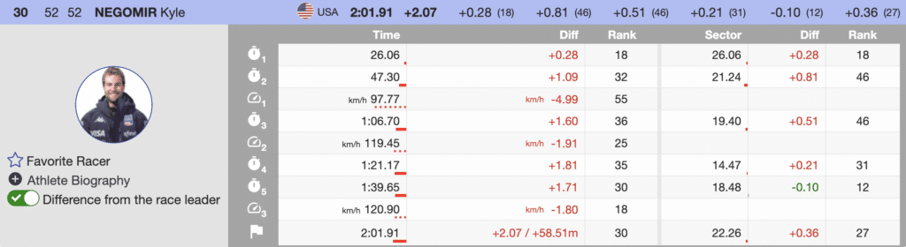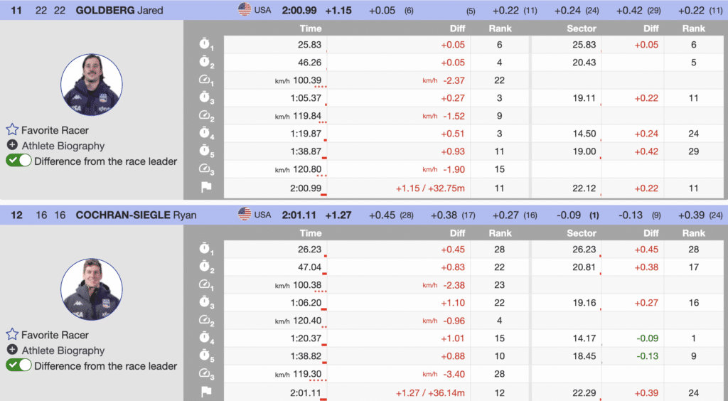 Notably, on Thursday, the time differential among the podium was (0.05), and during the super-G times, it was even tighter, delivering a (0.03) spread. However, today, the time difference was (0.60). These time spreads show the challenge the extra 30 seconds puts into the racer’s legs, magnifying all the mistakes made throughout the course.
