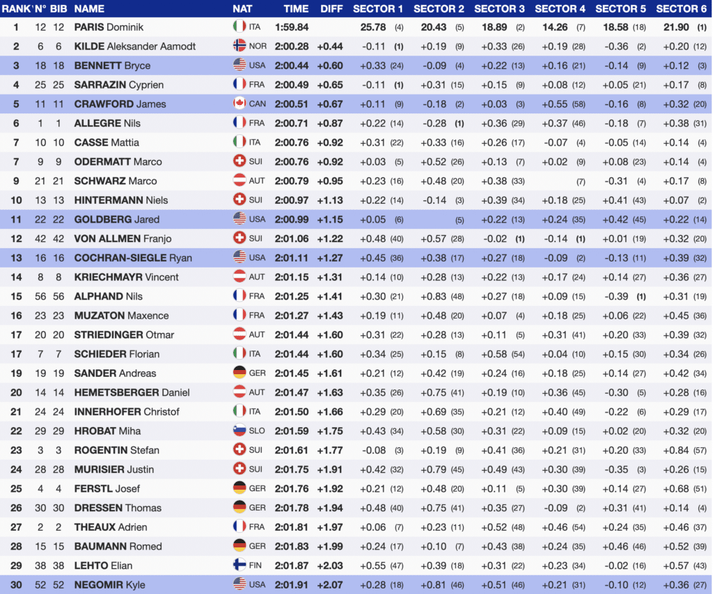 Paris’s victory broke an undesirable streak for Italy. The last Italian to win a downhill In Val Gardena/Gröden was Kristian Ghedina in 2001.