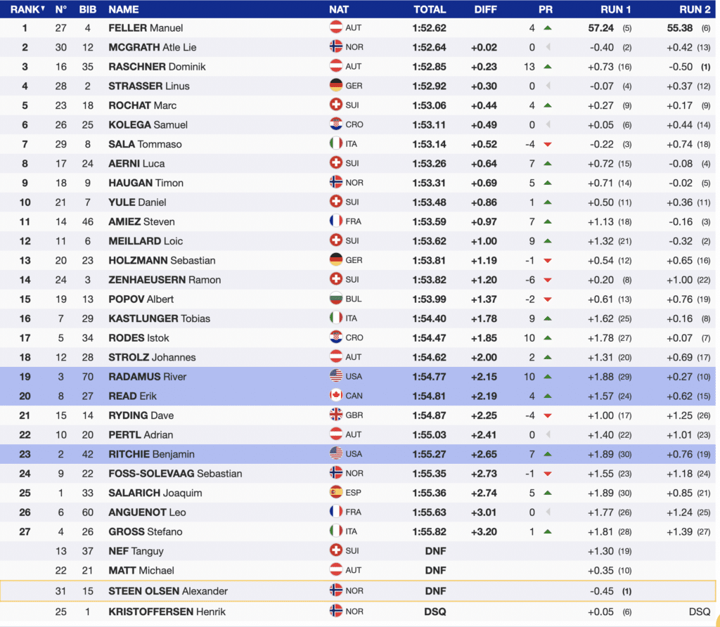 That left only the two young Norwegians at the start. Atle Lie McGrath finished just (+0.02) behind Feller, leaving only Steen Olsen in the start. When first-run leader Steen Olsen had trouble and did not finish, Feller knew he had won, and his teammate, who started the day with bib 35, would be third.