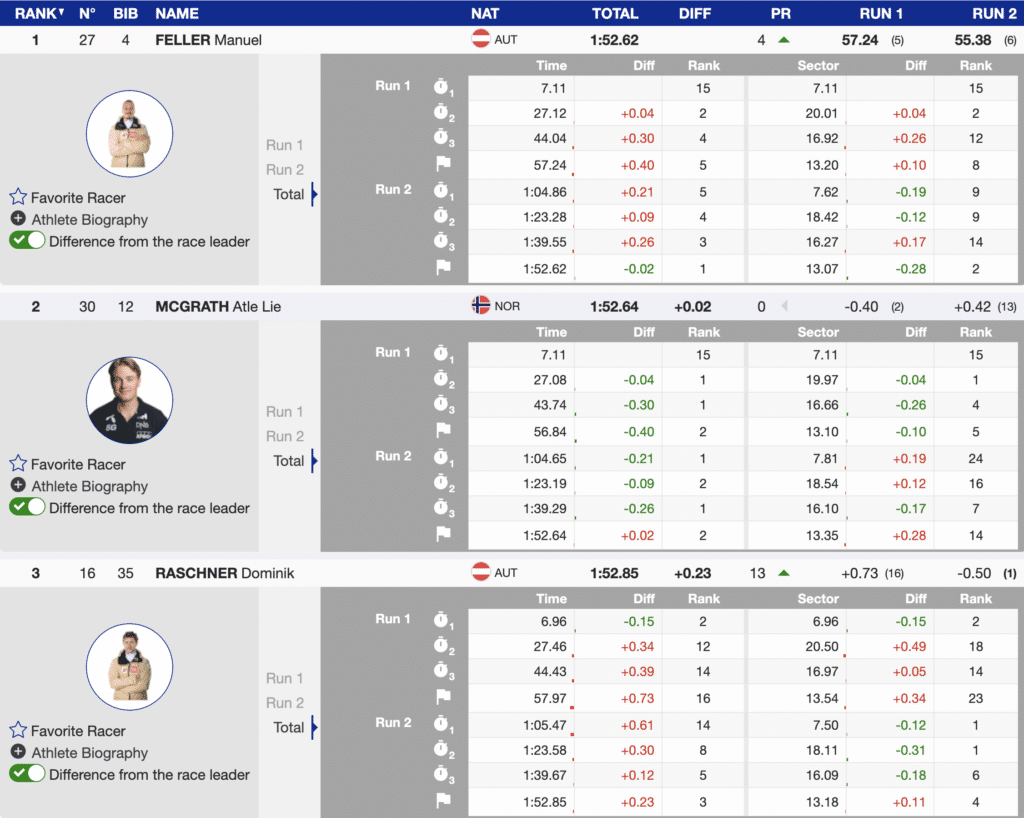 The excitement of the final racers of the second run of a World Cup tech race is fantastic. The first of the last five to ski was Feller. Feller executed at his limit and earned the top of the leaderboard (-0.23) ahead of his teammate Raschner.
