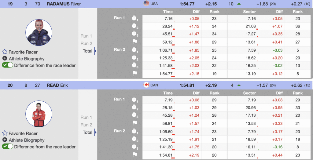 Canadian Erik Read was the last North American to race the afternoon course and crossed the finish in fourth place. Oddly, at that moment, he was immediately between Radamus and Ritchie. While these are not the results North Americans need to be competitive with the elites of slalom, it is a good start.