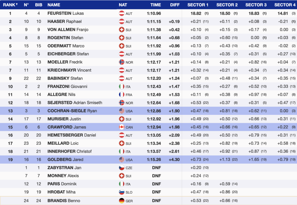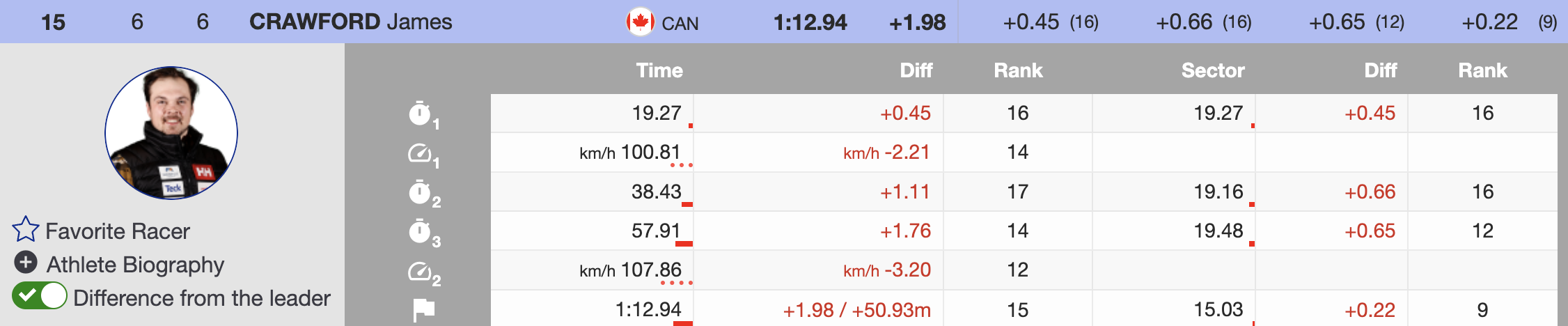 The Stifel U.S. Ski Team veteran delivered a clean, attacking run and closed strong with a fast Sector 4. - 15th – James Crawford (CAN) – 1:12.94 (+1.98)
