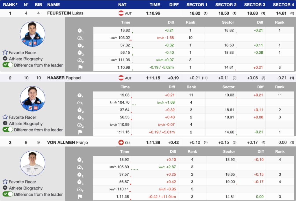 Austria took early control of the race, with Feurstein and Haaser posting strong runs in bibs 4 and 10. At the halfway mark, it appeared Austria might take both the win and the second spot on the podium—and that scenario held through the finish of the race, with von Allmen slotting into third.