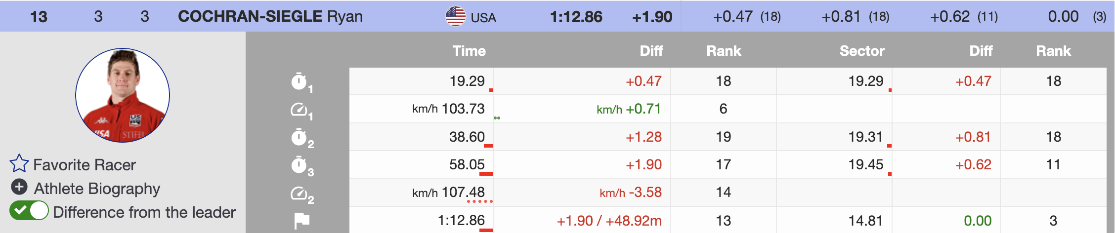 - 13th – Ryan Cochran-Siegle (USA) – 1:12.86 (+1.90)