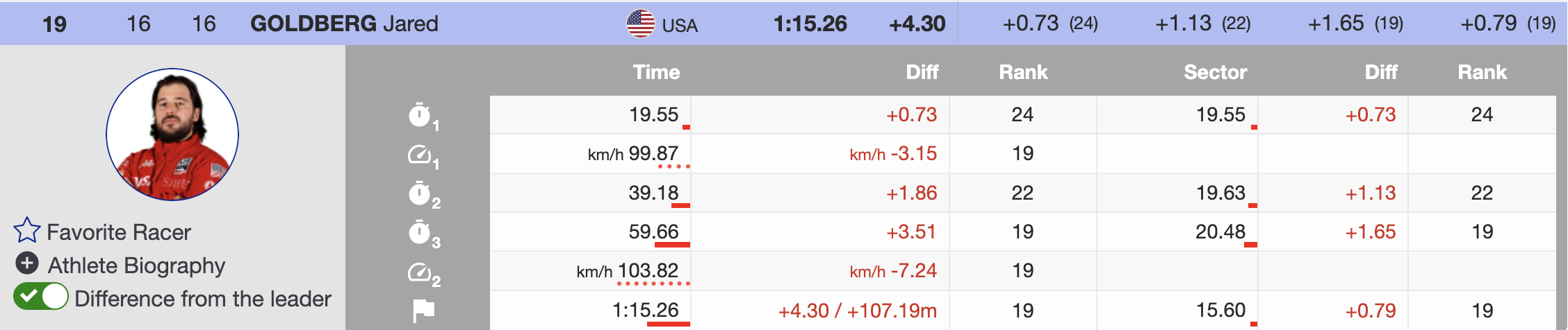 Second in the last super-G in Kvitfjell, Crawford couldn’t carry speed throughout the course. - 18th – Jared Goldberg (USA) – 1:15.26 (+4.30)