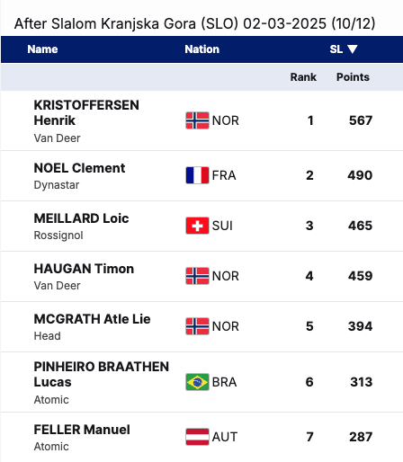 Henrik Kristoffersen holds the overall slalom lead, but Clément Noël, Loïc Meillard, Timon Haugan, and Atle Lie McGrath still have a mathematical shot at the title. Barring disaster, it’s Kristoffersen’s to lose.