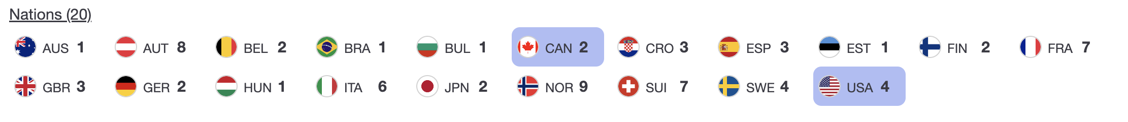 - Norway (5 wins) – Henrik Kristoffersen (2), Timon Haugan (2), Atle Lie McGrath (1)