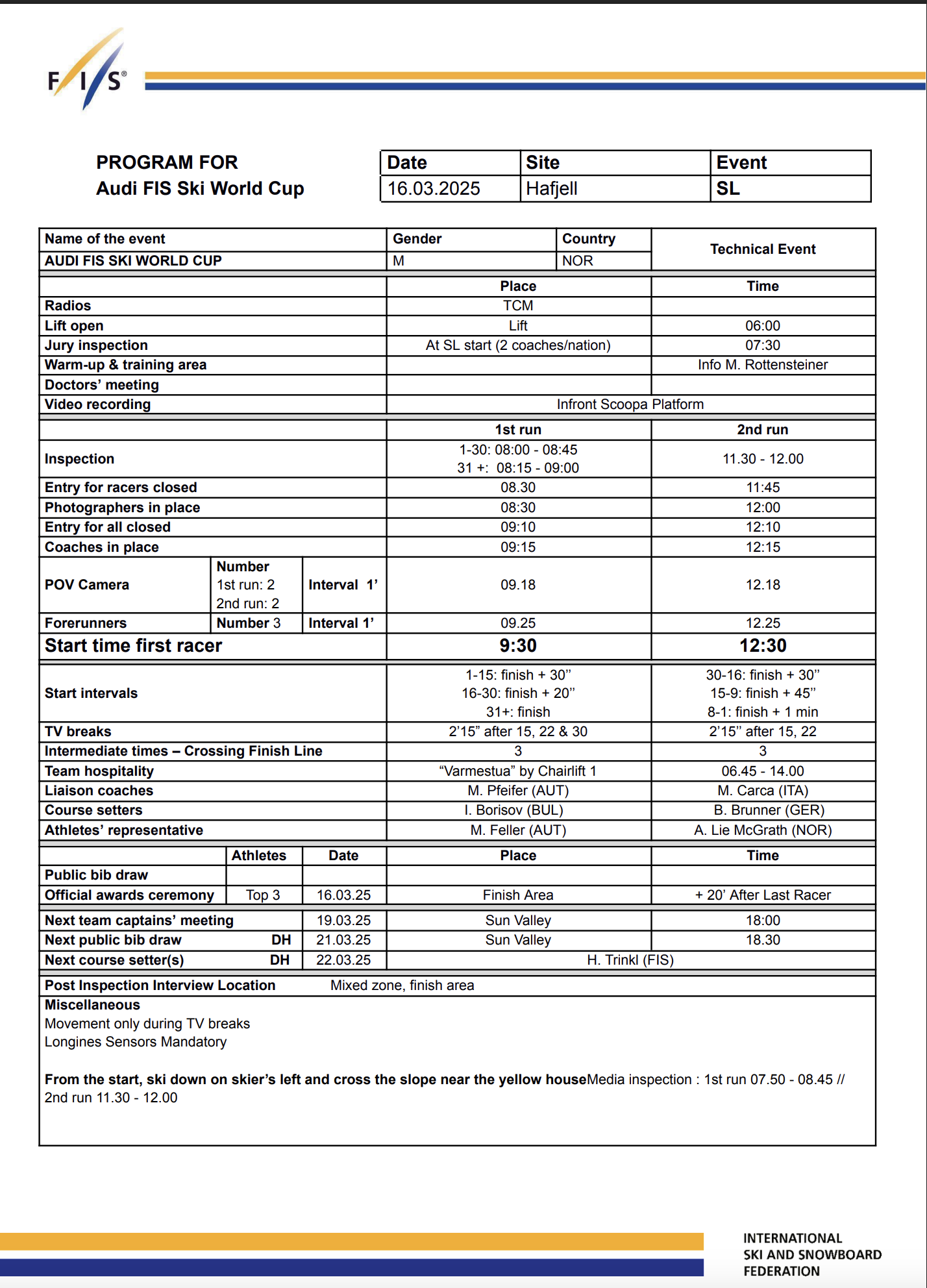 The slalom course will begin at an elevation of 440 meters and drop 195 meters to the finish. Known for its rolling terrain and technical turns, Olympia-Løypa will test the skiers’ agility, timing, and ability to adapt to the changing rhythm of the slope. The final slalom before the World Cup Finals promises intense competition, with athletes looking to secure crucial points in the discipline standings.