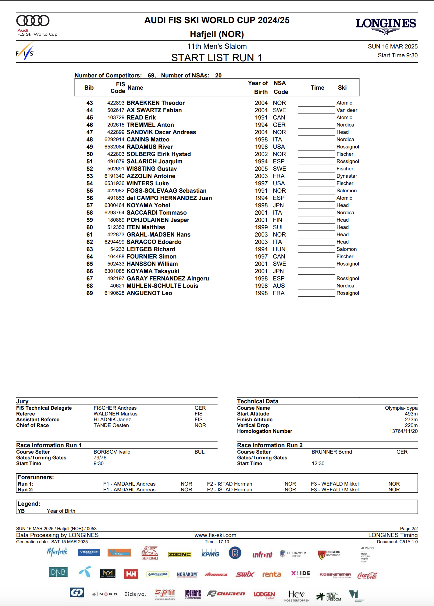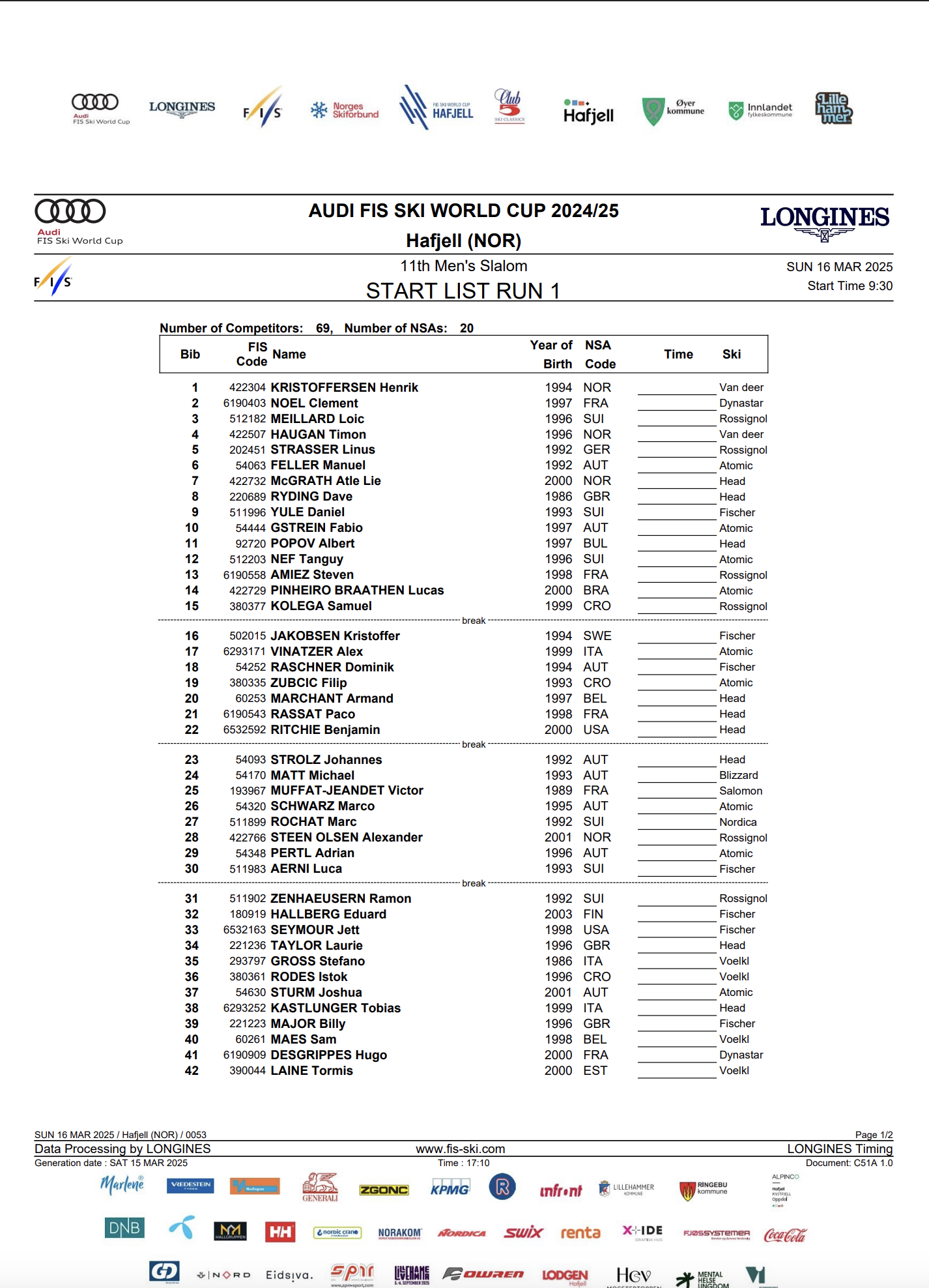 Sixty-nine men from 20 countries will compete in the World Cup slalom in Hafjell, Norway on Sunday, March 16.
