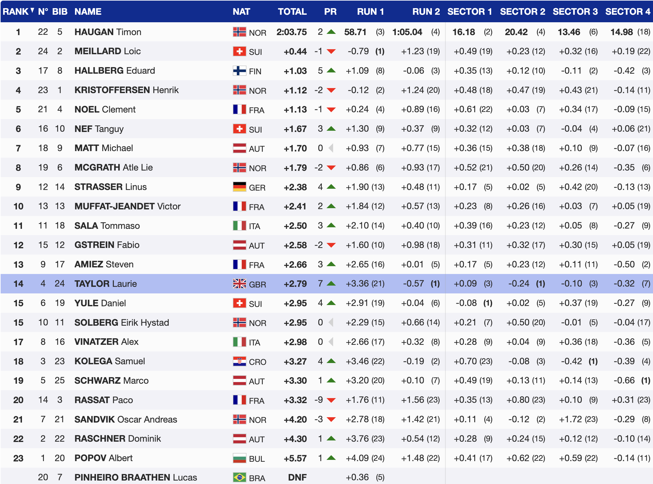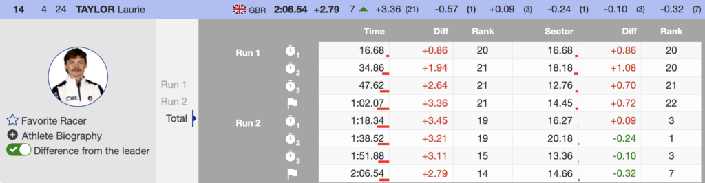 After finishing 21st in the first run on a deteriorating surface, Taylor came out attacking in run two. Starting early on a cleaner track, he committed from the top and built speed through every section.