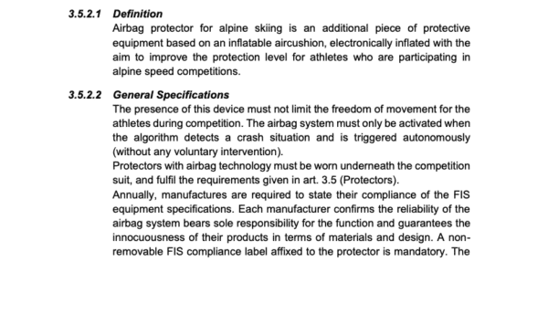 Manufacturers confirm that their products meet FIS technical specifications and accept full responsibility for the system’s function and safety. FIS will not allow athletes to start without a certified and active airbag protector in mandatory events.