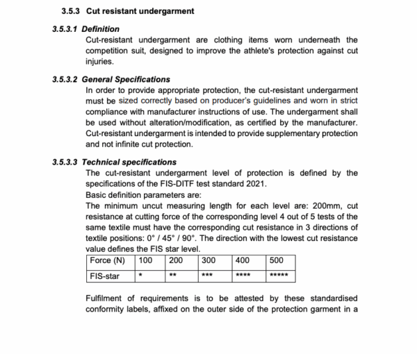 Cut-Resistant Undergarments Now Required at Elite FIS Levels 0 and 1