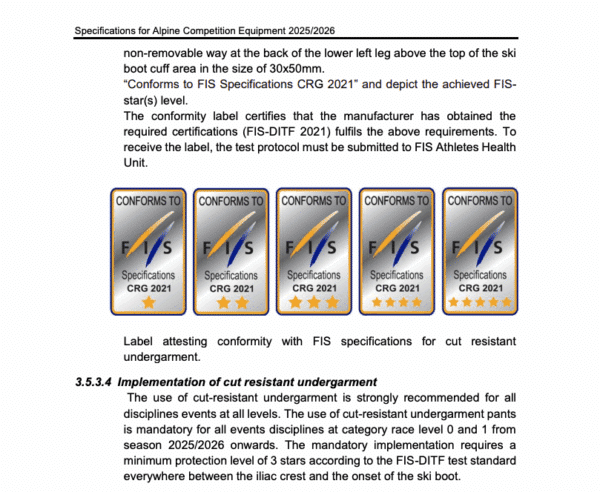 Starting in the 2025–26 season, FIS will require cut-resistant undergarments at all Level 0 and Level 1 alpine races. These include the World Cup, World Cup Qualification, World Championships and level 1 competitions, Continental Cups, Europacup Qualification, Junior World Championships, and Universiade. The new rule aims to reduce the risk of leg lacerations during crashes—injuries often caused by sharp ski edges.