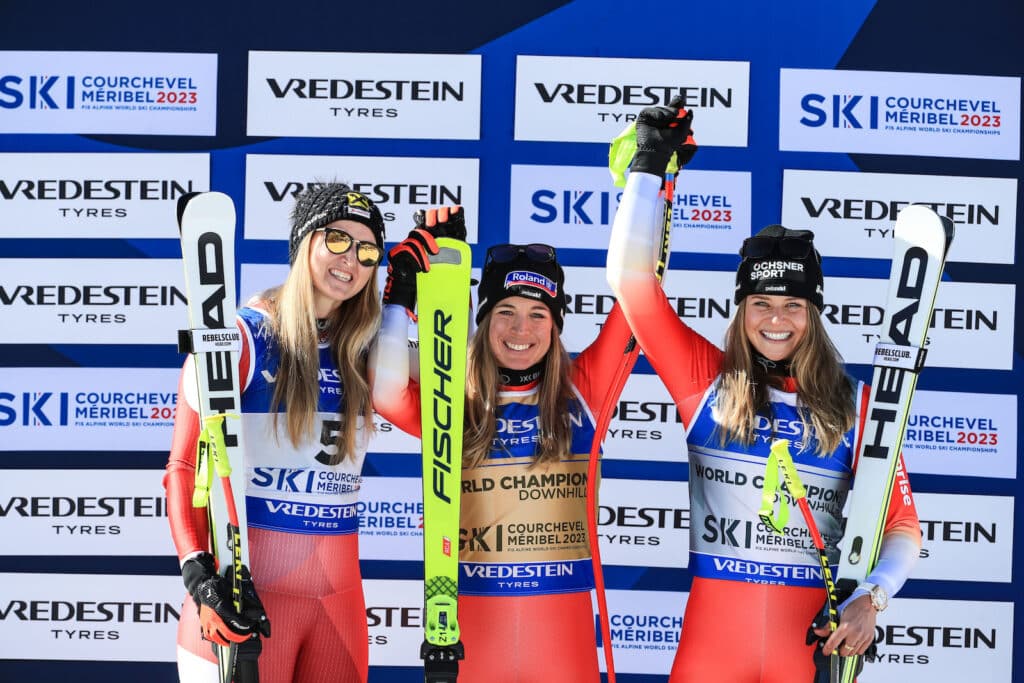 Swiss teammate Corinne Suter finished (+0.12) behind to take bronze for her fifth world championship podium. Suter was the defending champion and won Olympic gold a year ago.