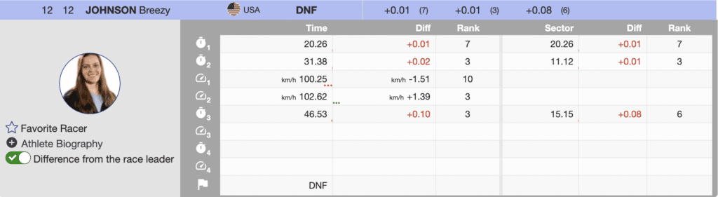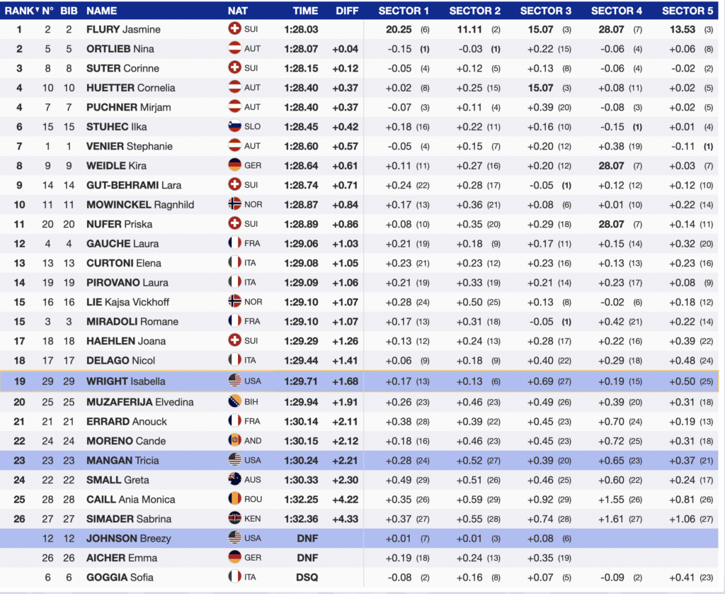 American Breezy Johnson pushed hard and was only (+0.10) behind Flury at the end of the third sector, but lost her balance and fell about halfway through her run. She got up and skied down without apparent injury.