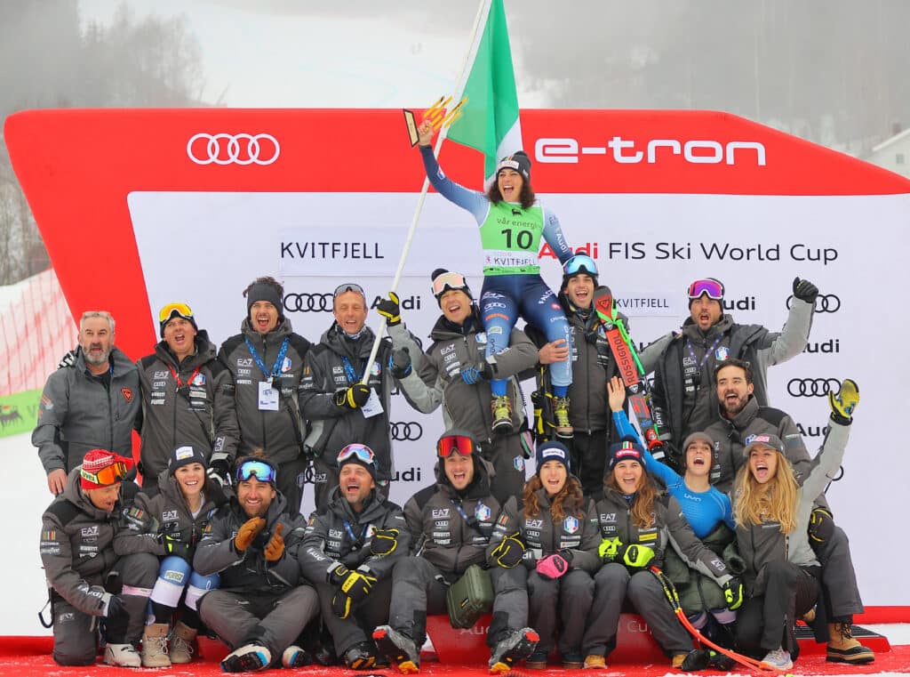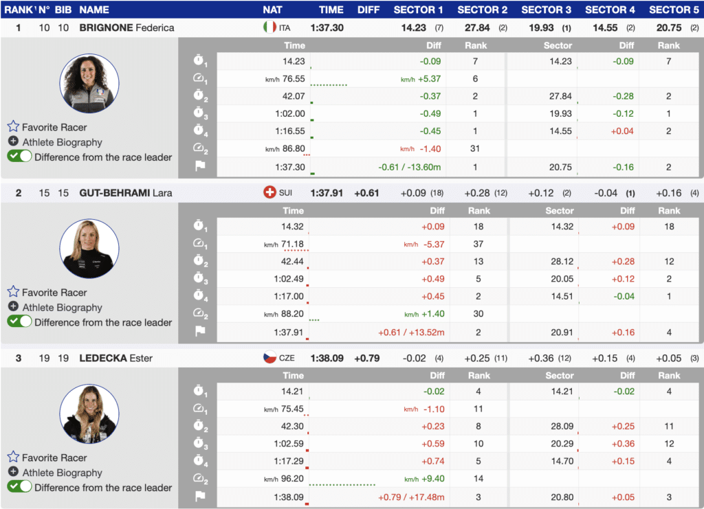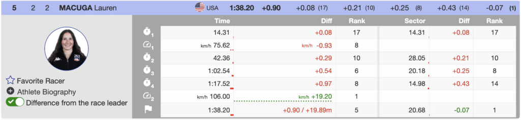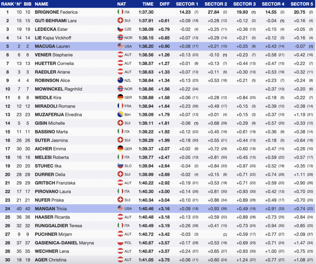 Once the race started back up, Macuga sat in the leader’s chair until bib-10, when Federica Brignone came through, moving the US athlete out of the lead by nine-tenths. The Italian set her lead early and attacked each section of the course.