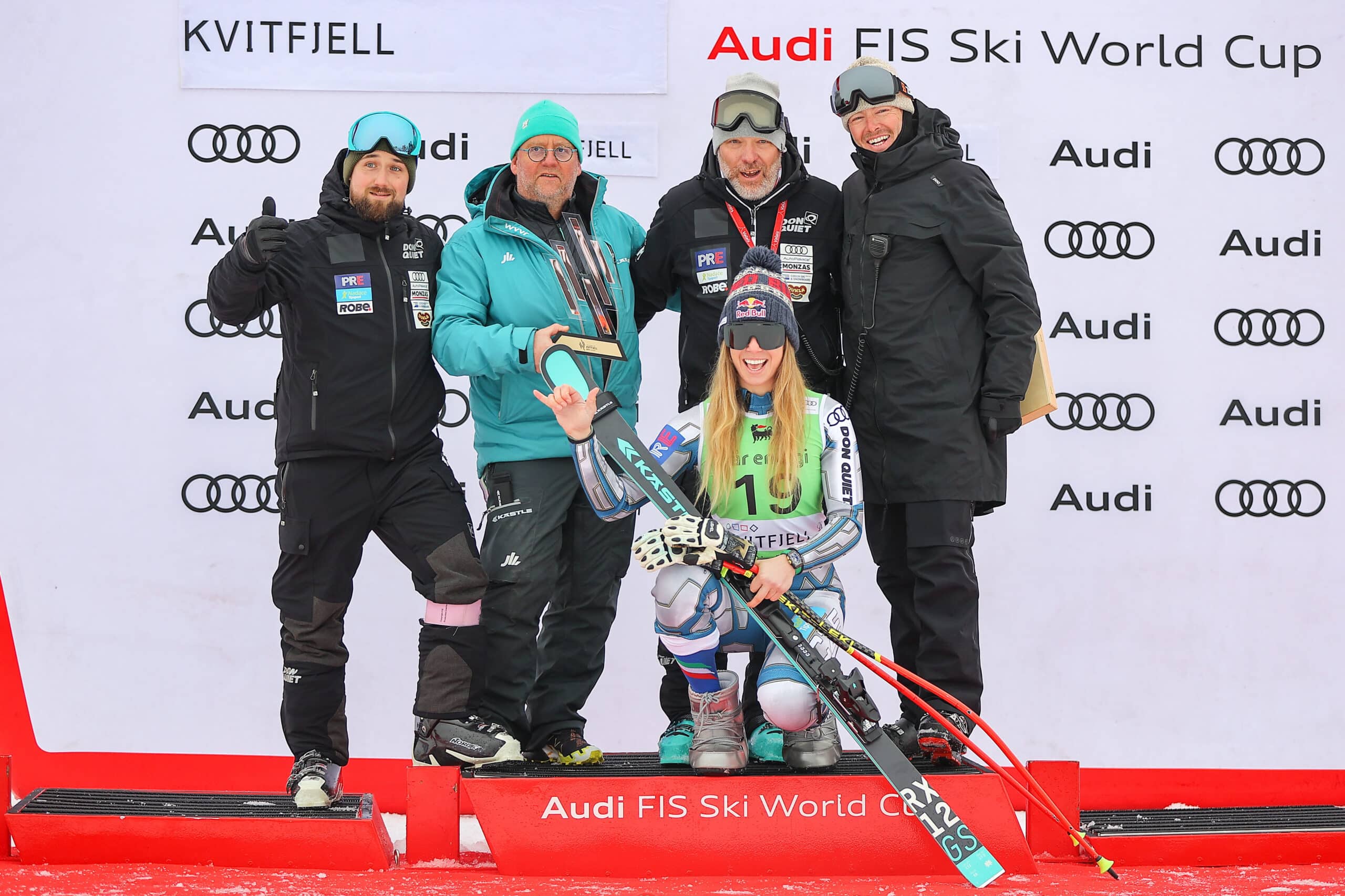Featured image: Kvitfjell podium on the second day of super-G. Credit: GEPA
