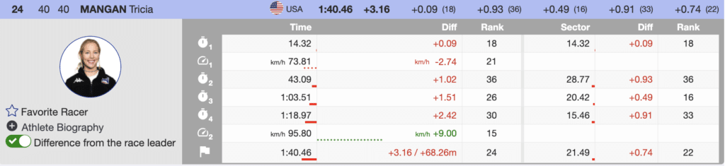 Tricia Mangan pushed out of her 51st World Cup start. Through the top section she was off the lead, so she was pushing through the midsection to make up time. However, the fog rolled back in towards the bottom, which caused the athlete to back off slightly. She was still able to come through the finish, clinching onto 24th place.