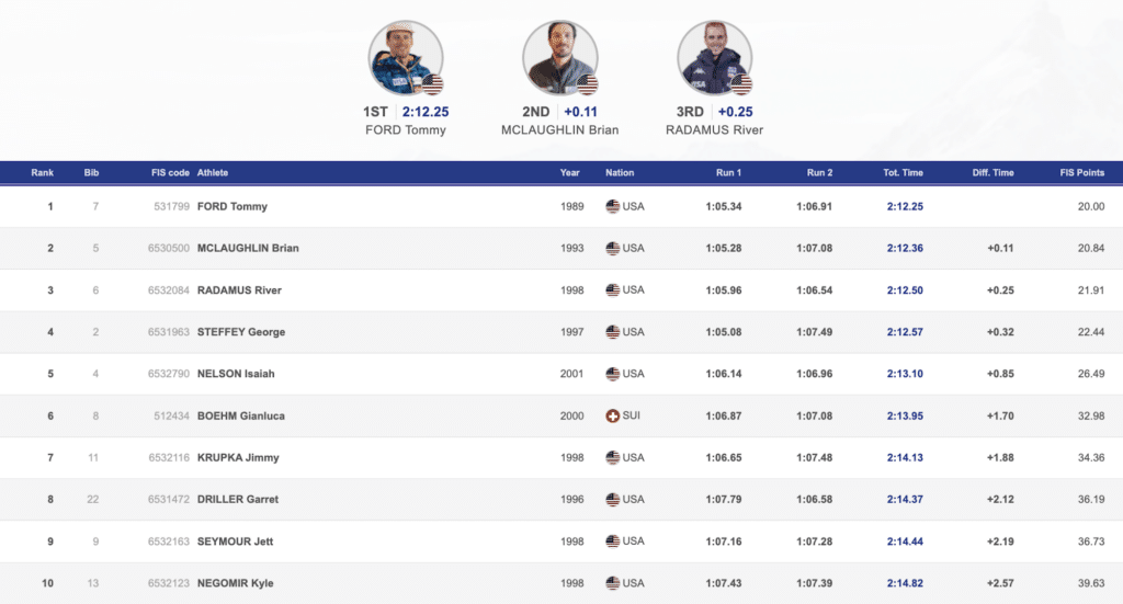 Only (0.11) seconds separated Ford and Brian McLaughlin, who finished in second place. Right behind McLaughlin was River Radamus, who was (+0.25) seconds off of Ford.