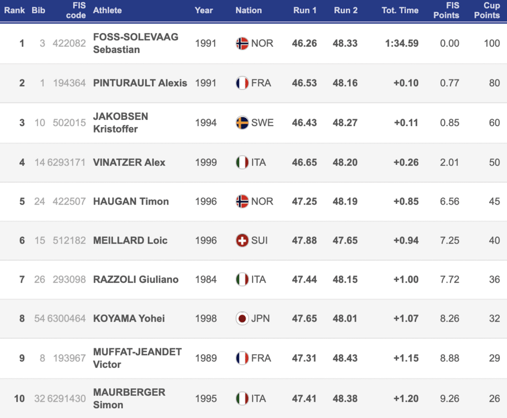 Foss-Solevaag finished .10 seconds ahead of defending overall champion Alexis Pinturault, who moved up from fifth in the first leg.