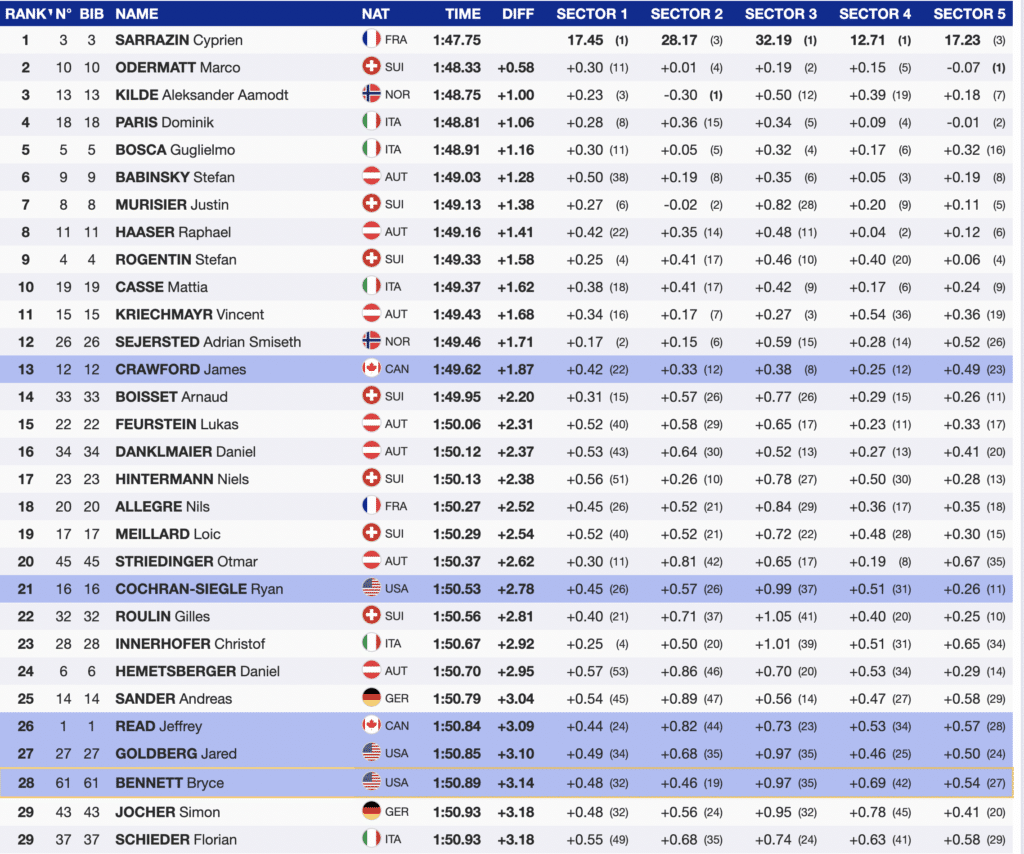 Top 30 results from the Wengen super-G and analysis of the fastest three and top 30 North Americans.