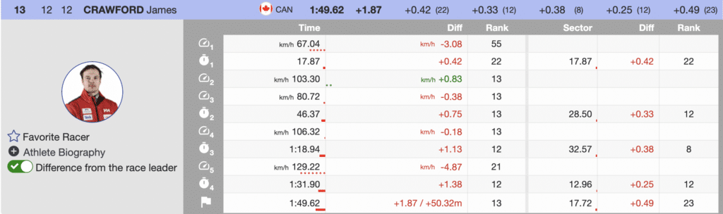 Canada’s James Crawford was the second of the North Americans to race. Bib 12 had a disappointing race in Thursday’s downhill and wasn’t pleased when he finished today. However, the reigning World Champion was North America’s fastest, finishing a respectable 13th (+1.87).