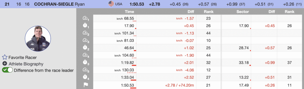 The fastest Stifel US Ski Team member was Olympic silver medalist Ryan Cochran-Siegle. He finished the Thursday downhill from the same start, a season-best sixth. Today in the super-G, he was 21st (+2.78) slower than Sarrazin.