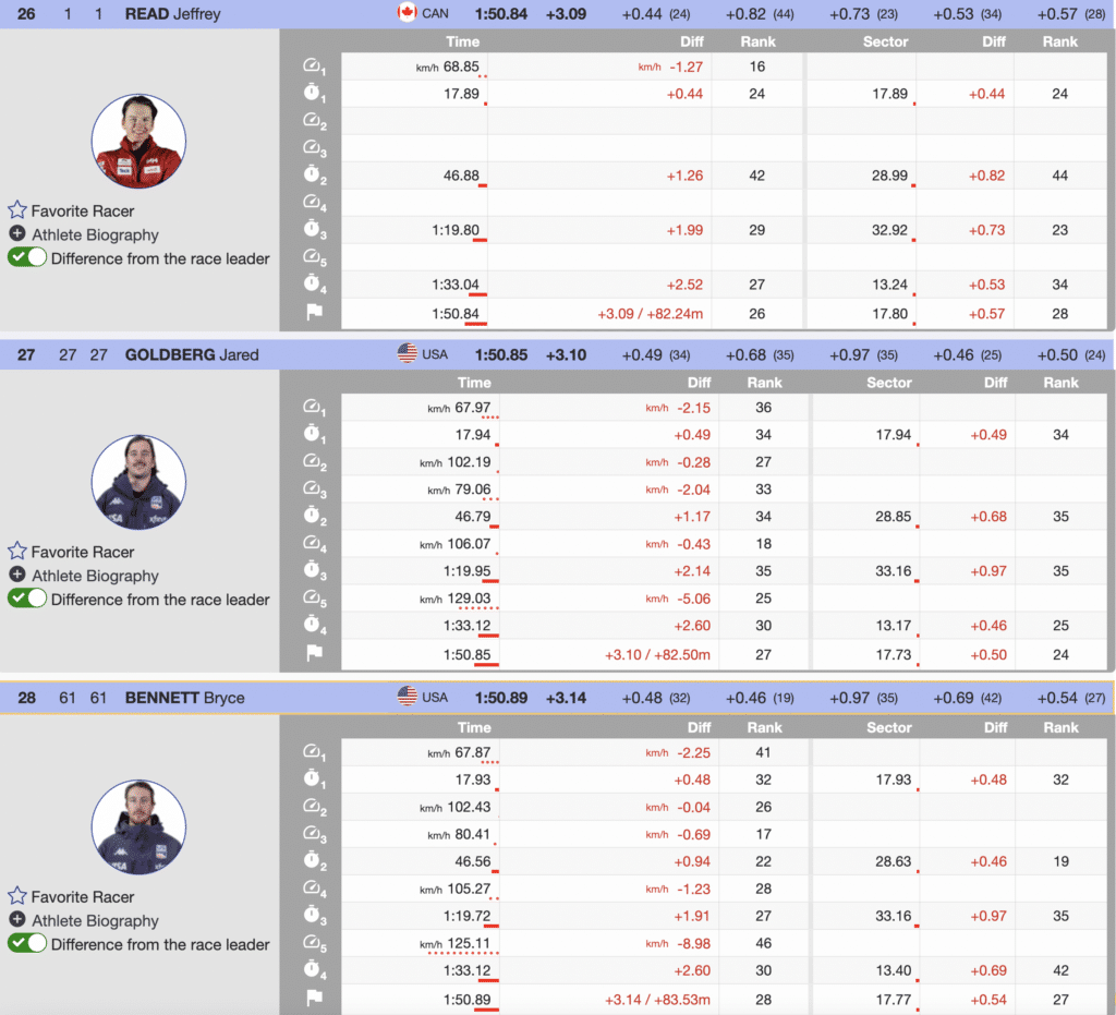 Three other North Americans were among the top 30. Canada’s bib one, Jeffrey Read, finished 26th (+3.09). Also, Stifel US Ski Team’s Jared Goldberg skied into 27th (+3.10), and the last racer on the course, Bryce Bennett, finished 28th (+3.14).