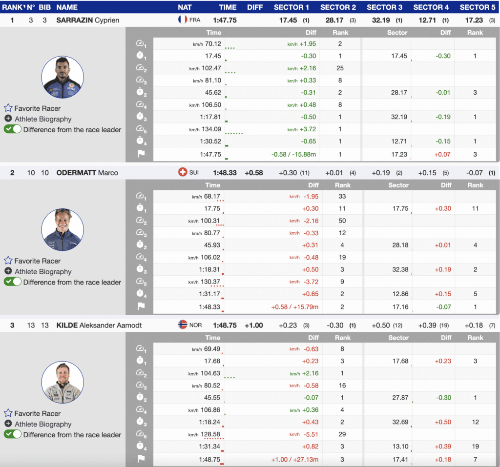 The next threat that Sarrizin fended off was Norway’s Aleksander Aamodt Kilde. Kilde had a lead after the first two sectors, but at the finish, he was third, a full (+1.00) back. Kilde has earned six World Cup podiums this season but is searching for his first victory. Saturday will be his next opportunity.