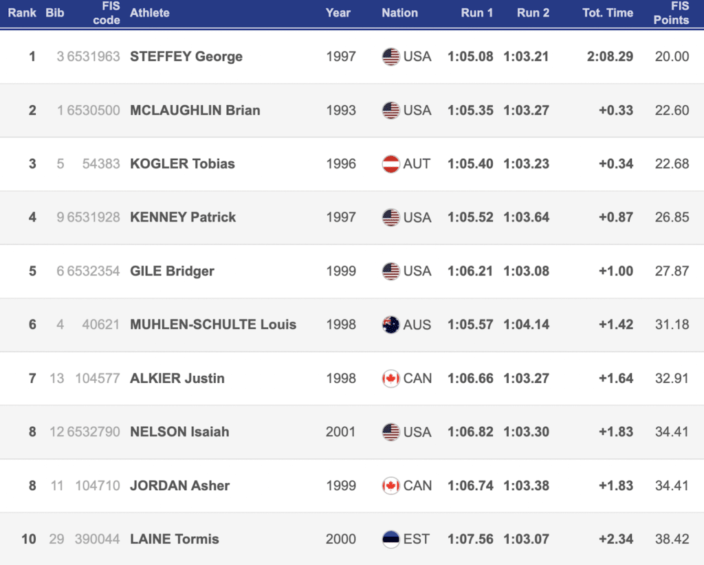 George Steffey, a former USST athlete and Dartmouth student, found himself at the top of the podium with a time of 2:08.29. His Global Racing teammate, Brian Mclaughlin, who also attended Dartmouth, was 0.33 second behind him in second. Tobias Kogler, who is part of the World Racing Academy, snagged third place, separating UNH graduate Patrick Kenney from his Global Racing teammates.