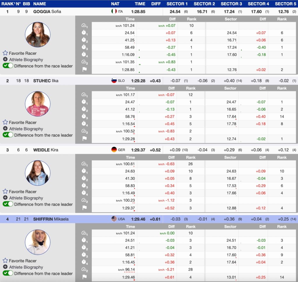 It looked like Austria would have a member on the podium until the Slovenian skier IIka Stuhec, bib 18. She showed courage, skiing into second and replaced the Austrian on the podium. However, Stuhec was still 0.43 seconds behind the brave leader Goggia.