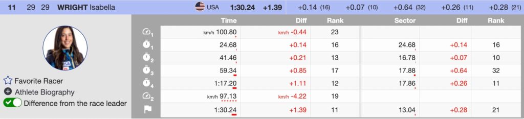 USA’s Isabella Wright failed to finish yesterday but was a racer who met the challenge. Skiing near her very limit, Wright stayed committed to moving to the outside ski and crossed in 11th place. Wright is producing high-level skiing and is emerging as a consistent player in the World Cup.