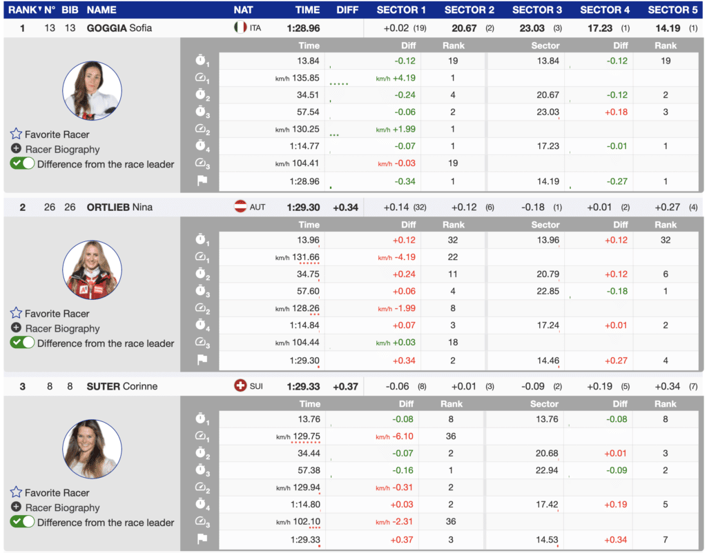 With two sectors left to the finish, she was only 0.06 faster than second place Ortlieb; however, as expected, she found a way to win. Goggia skied 0.28 faster than Ortlieb over the final two flat sections to win by 0.34. Notably, this is Goggia’s fourth consecutive Lake Louise downhill victory.