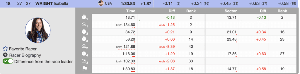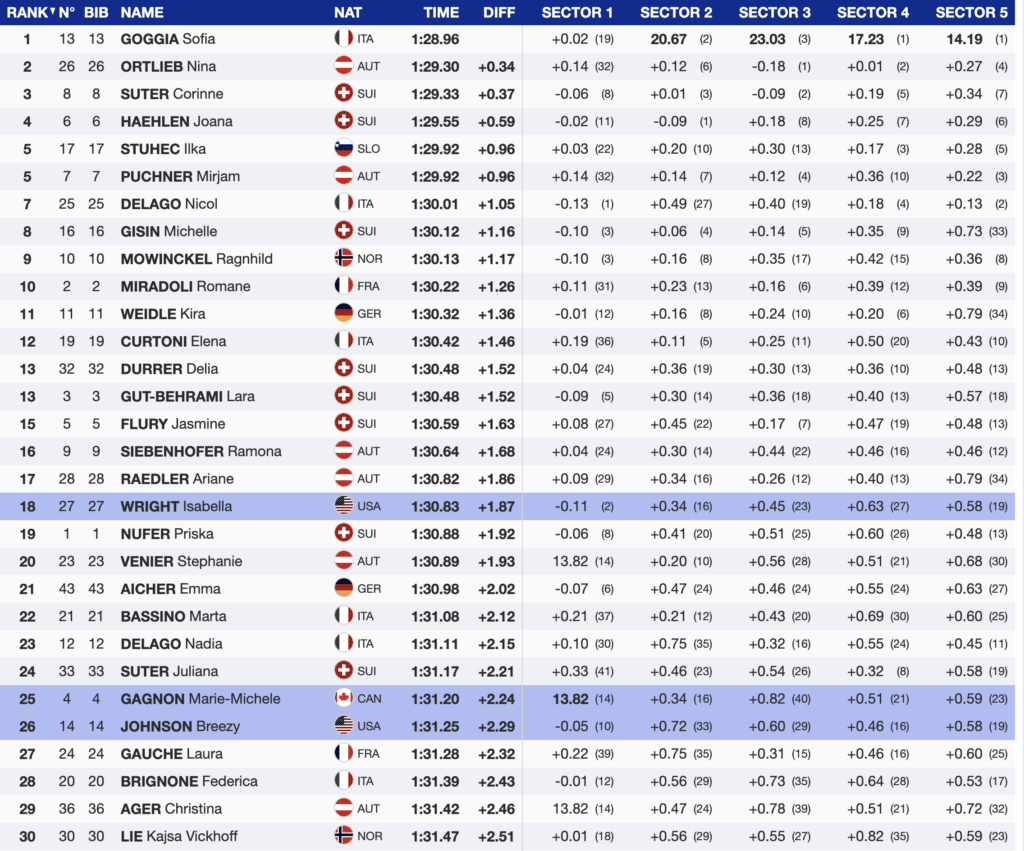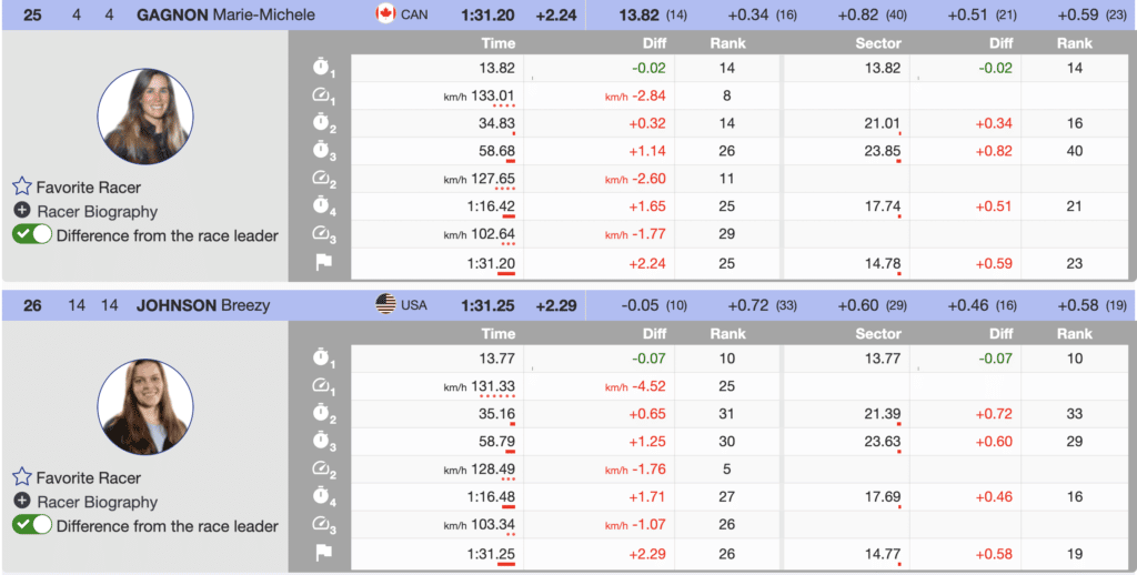 Immediately in front of Johnson was Canada’s best finisher, Marie-Michele Gagnon. Gagnon skied solidly from the top to the finish except for sector three. On the pitch, she lost 0.82 to Goggia and didn’t carry the speed required to complete for a higher position into the flats.
