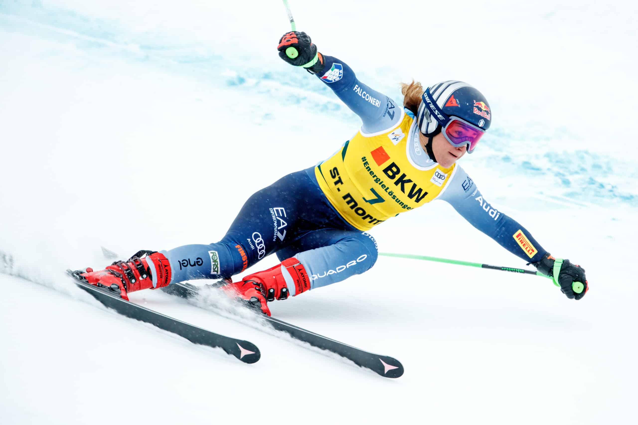 Mikaela Shiffrin won last year’s St Moritz super-G edition, but today, compared to Goggia, she seemed to struggle with her left foot turns. With a ski that was not carving as smoothly as usual, she lost time to Goggia in the bottom three sectors of the course. However, Shiffrin’s less-than-best is still amazing and skiing with bib 11, she crossed in third place and ended the day 4th (+1.08).