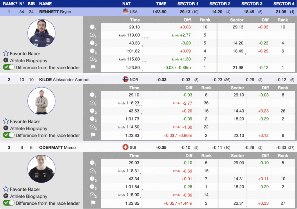 The 2023-24 downhill season starts with another familiar drama. Established superstars fought for victory, and the older veteran Kilde proved he was ready to defend his downhill throne. He finishes 2nd (-0.02) ahead of 3rd place Switzerland’s Marco Odermatt. Both men pushed the limits of what was possible. Kilde and Odermatt used superior skiing through the difficult Ciaslat section to earn their podiums.