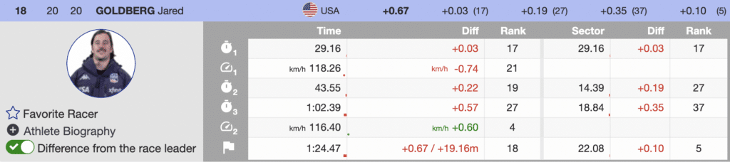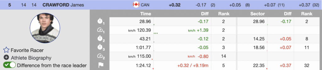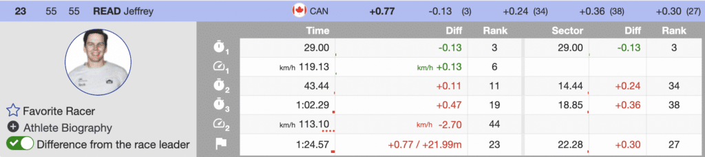Canadian James “Jack” Crawford continues to show he will compete for World Cup victories and finishes 5th (+0.32). Like Odermatt, Crawford has shown an extremely high skill level in three events: downhill, super-G, and giant slalom. Crawford was the most successful North American male of the 2022-23 season and is hinting that his position among the elite will continue.