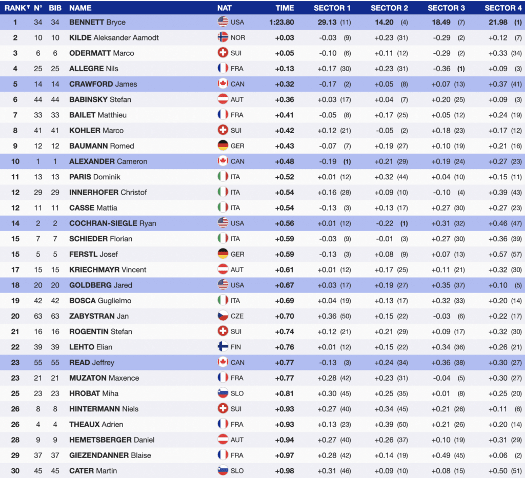 Because the light improves throughout the race on the problematic Ciaslat section, high bibs are expected to do well in Val Gardena/Gröden. Today, nine racers with bibs above 30 scored. The last to do so was bib 63 Czech Republic’s Jan Zabystran 20th (+0.70). The time differential between the first and 30th place racers was a mere (+0.98).