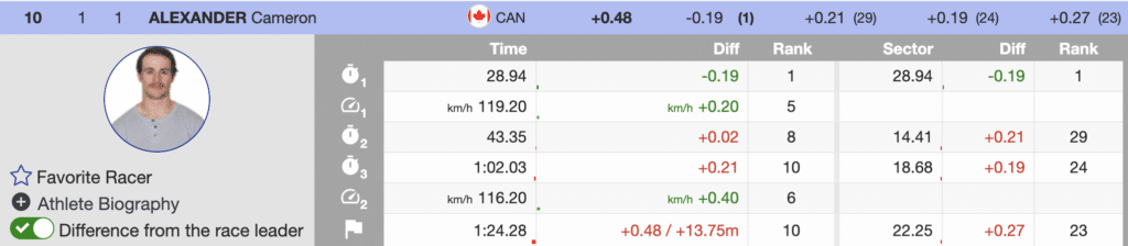 Canadian Cameron Alexander, 10th (+0.48), was the first male downhill racer to cross a 2023-24 World Cup speed event finish. At that moment, the long-awaited downhill season officially began. His time on the preplanned shortened Saslong course was 1:24.28. Alexander held the early lead until bib 6 Odermatt was (-0.43) faster.