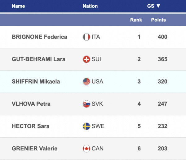 Women’s GS ranking and a look back at the ranks of North Americans last season