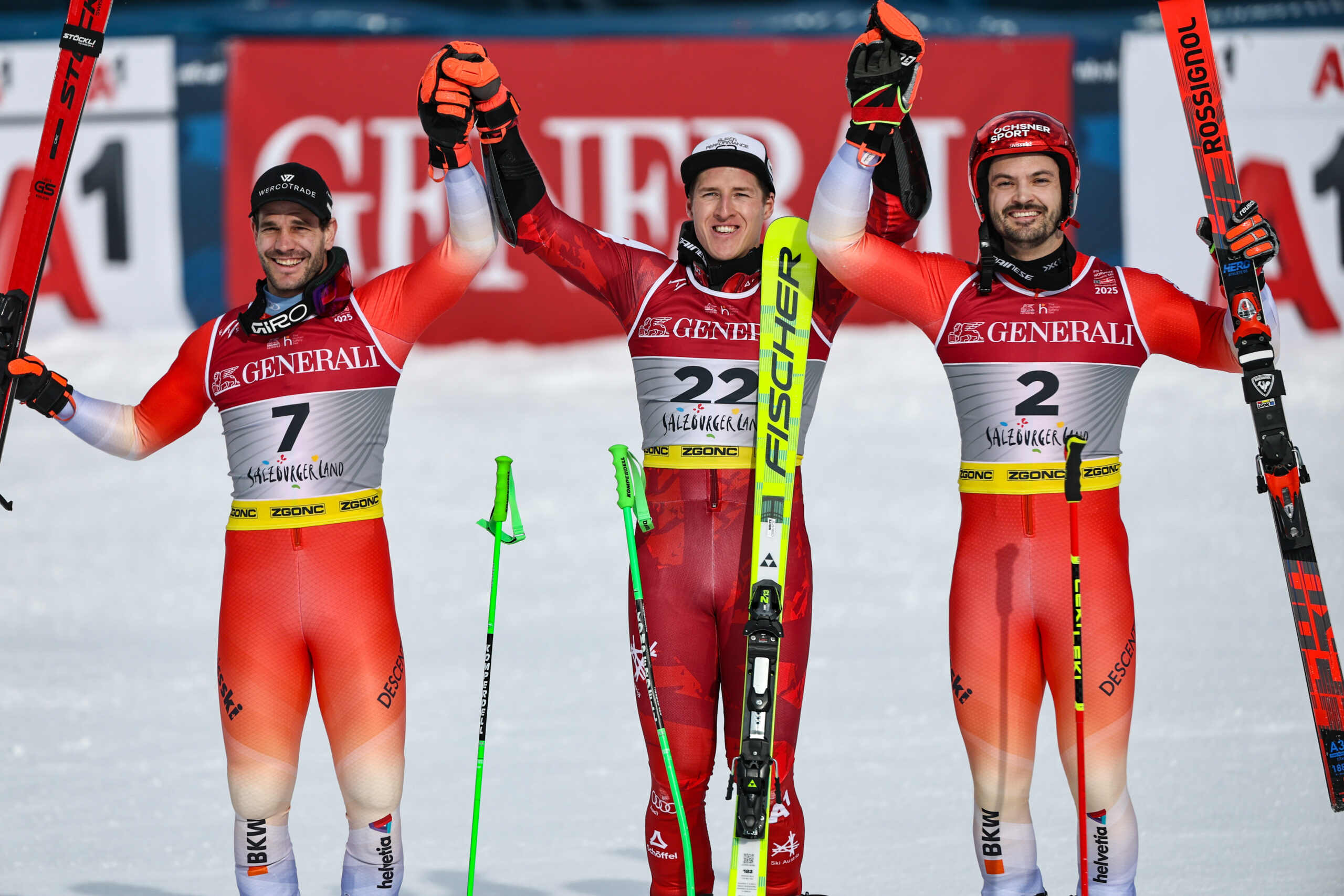 His teammate, Loïc Meillard, earned another championship medal, achieving bronze. Meillard has had success on this hill prior to today, claiming his first World Cup podium in both GS and slalom, winning in World Cup Finals. In total, in his six World Cup races in Saalbach, he has a win, three 2nd places, a 4th, and a DNF.
