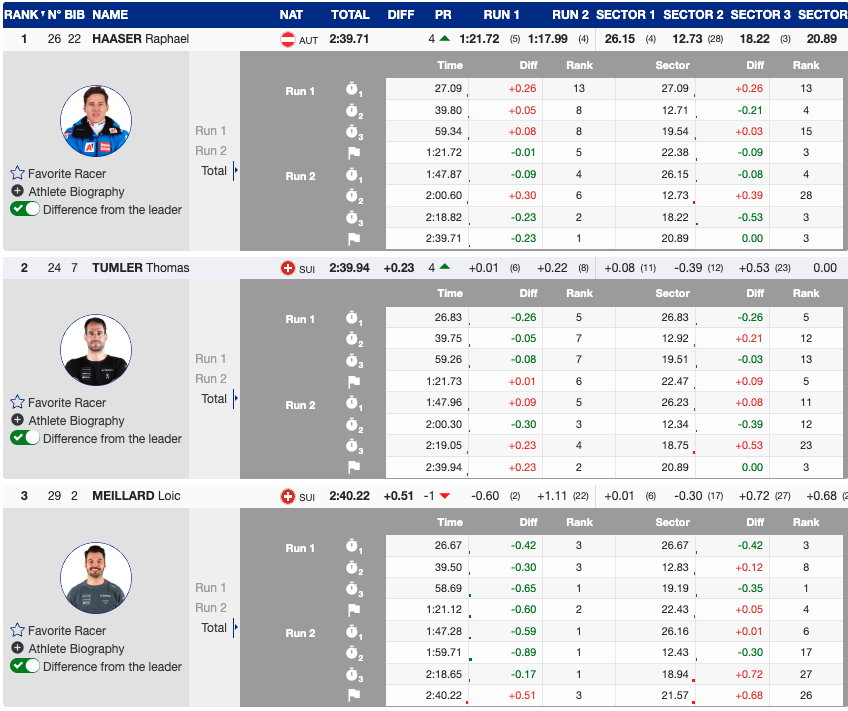 After the first run, Timon Haugan was leading the charge, -0.02 ahead of Meillard.