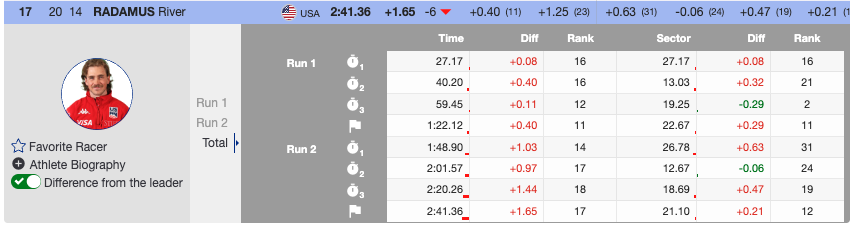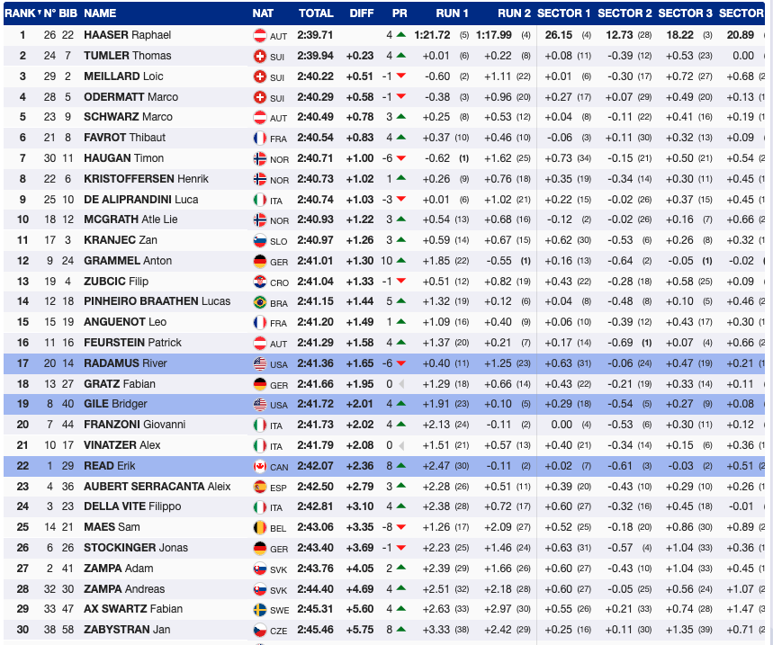 His teammate, River Radamus was the last North American to race the GS, finishing the first run in 11th place, 1.02 behind the lead. He fought through the second run, but continued to lose speed in crucial sections, and dropped down into 17th place.