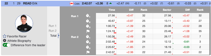 Erik Read of Alpine Canada Alpin was the first athlete to kick out of the start on the second run (+3.09).