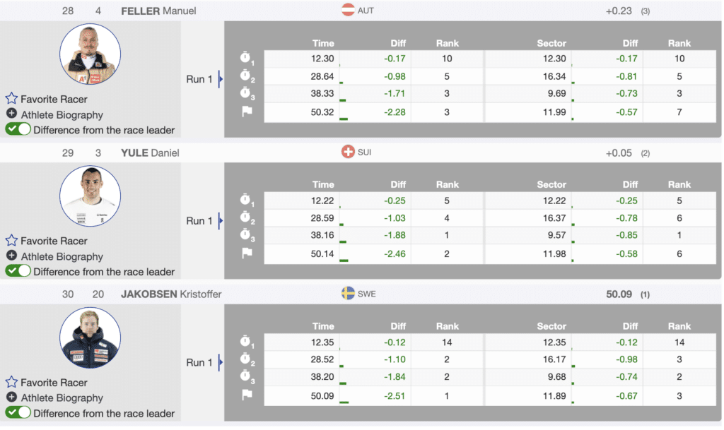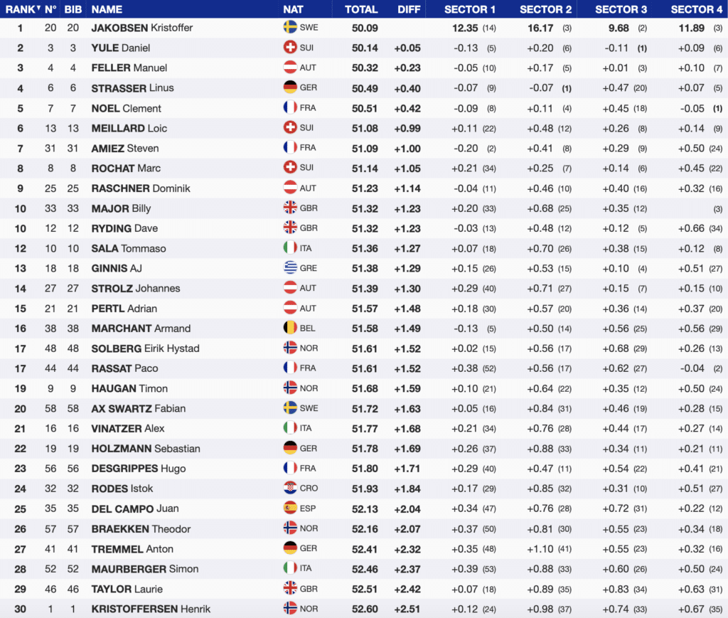 Yule held off his close competitors, including Manuel Feller, Dave Ryding, and Clement Noel. He sat in the leader’s chair until bib-20 Kristoffer Jakobsen of Sweden came through the finish line -0.05 ahead.