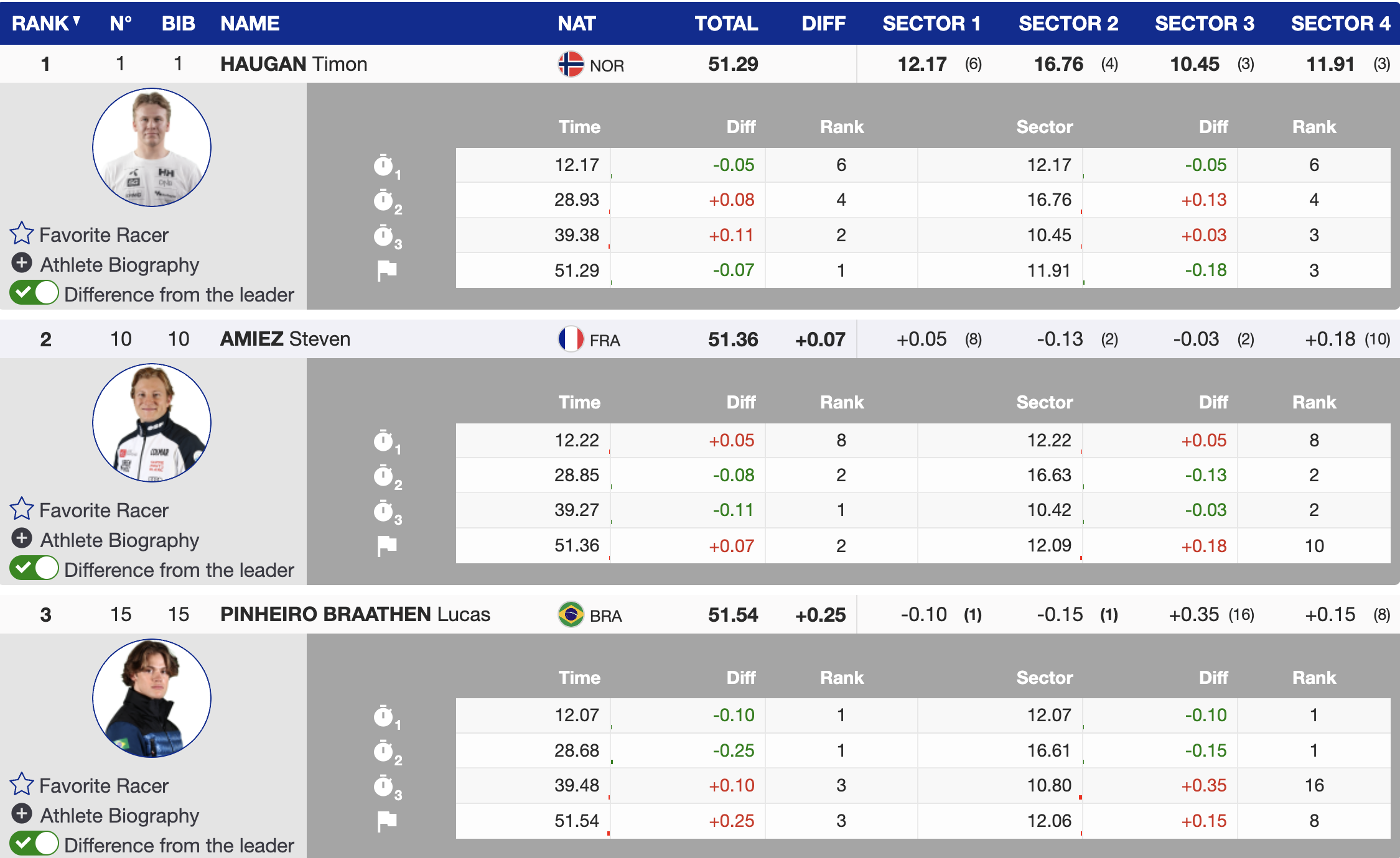 The Norwegians swept the podium in the Wengen a week ago and after the first run, it was bib 1 Norwegian Timon Haugan with a 0.07 lead over French skier Steven Amiez and 0.25 ahead of Brazilian skier Lucas Pinheiro Braathen.