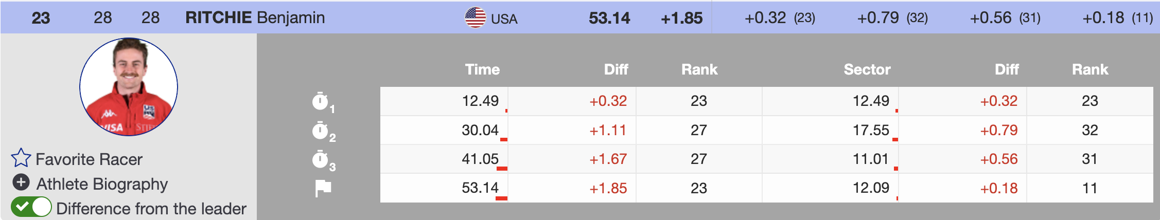 With several other first 30 competitors finishing over two seconds behind the leader, there was significant opportunity for higher bib numbers to ski strong and qualify for the second run. The forgiving conditions and wide gaps on the leaderboard left room for surprises, setting the stage for an exciting second half of the race.
