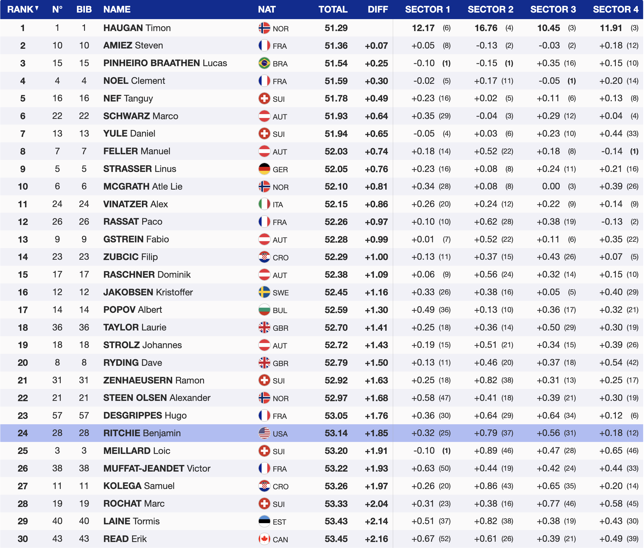 France’s Hugo Desgrippes, starting with bib 57, was the last higher-bib racer to secure a spot in the second run. He delivered a strong performance to end the morning 23rd fastest, 1.76 seconds off the lead. These results underscore the opportunities for later starters to break through on the Ganslernhang slope.