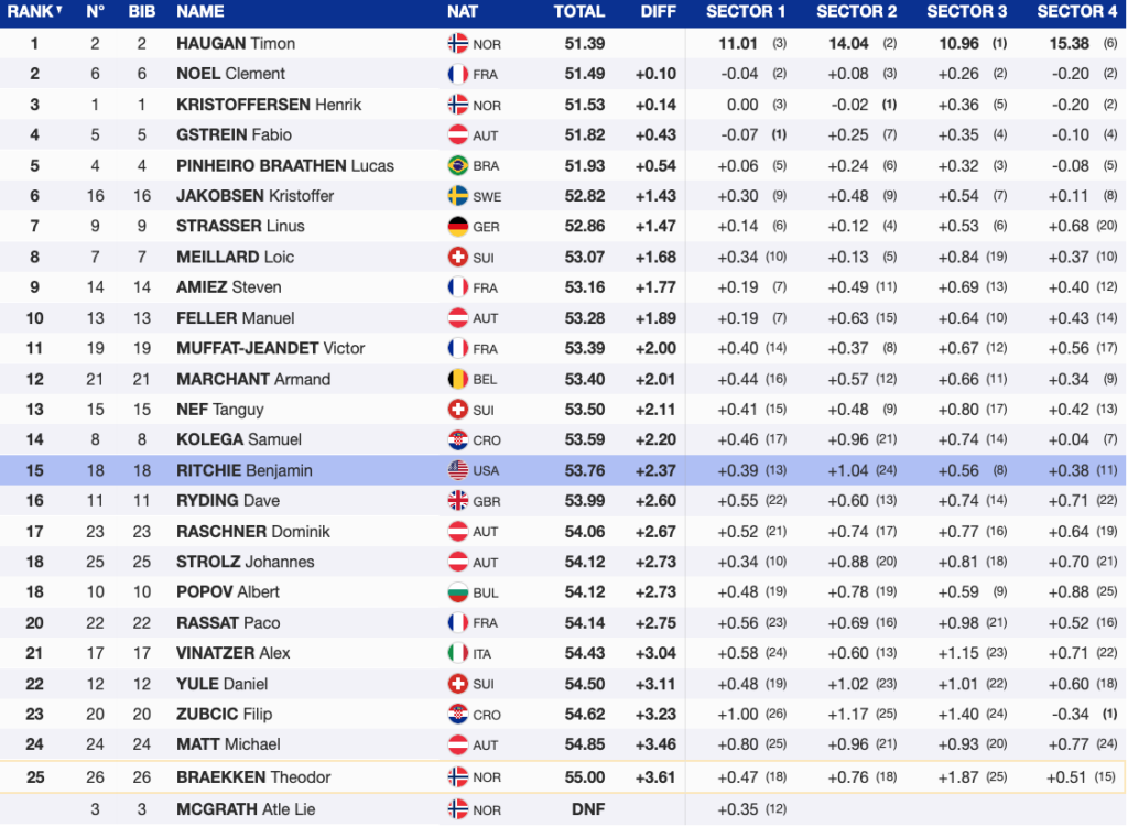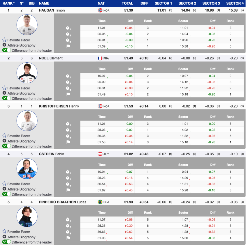 Austria’s Fabio Gstrein sits fourth, +0.43 off Haugen, followed by Brazil’s Lucas Pinheiro Braathen at +0.54. Both skied with strong energy and rhythm but couldn’t match the clean transitions Haugen generated through the middle sectors. Three of the top five—Kristoffersen, Haugan, and Pinheiro Braathen—have Norwegian roots, a testament to Norway’s deep technical talent.